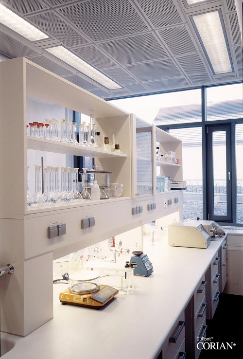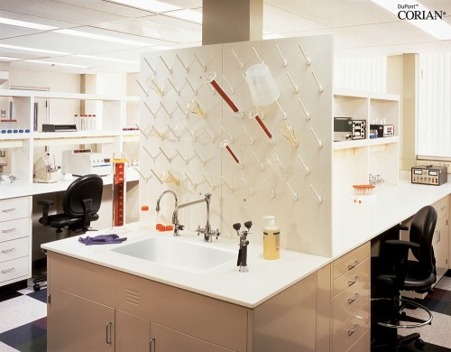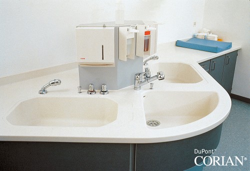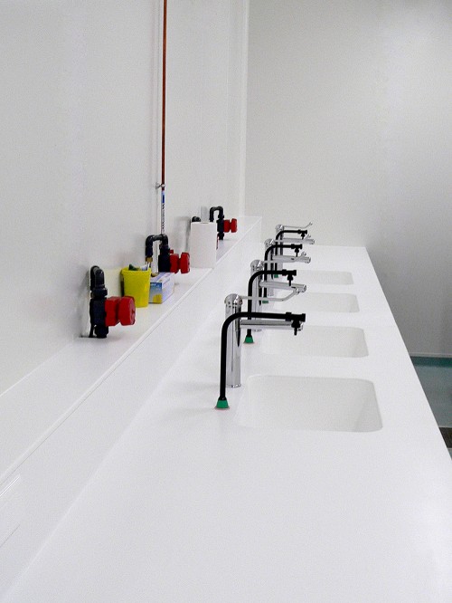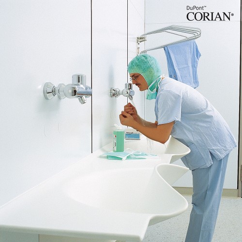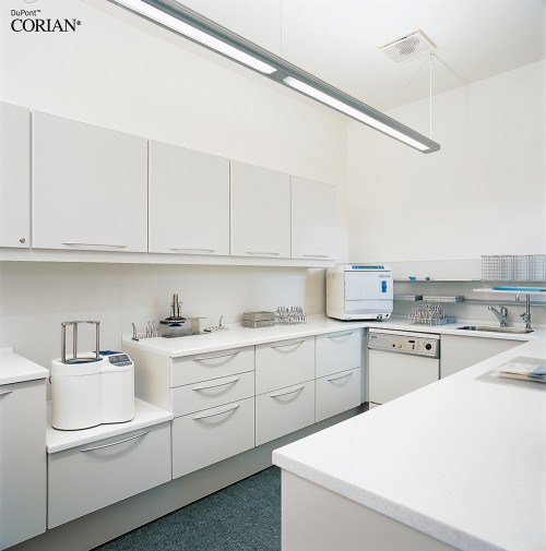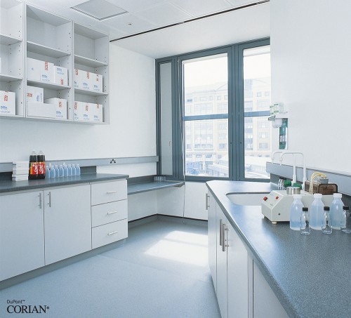 Healthcare & laboratories Create a safer environment – exceed hygiene standards. The primary consideration in designing healthcare and scientific environments is the prevention of infection. Acrylic solid surfaces are fabricated with seamless, homogenous joints, making them easy to clean and disinfect. With an acrylic solid surface fabrication, there are no crack or crevices for germs to harbour, and it will withstand repeated washing and disinfecting without deterioration. Acrylic solid surfaces can be used to fabricate hygienic laboratory work tops, countertops, sinks, scrub-in areas, nurses stations, shower basins and baseboards. It is slip and stain resistant and extremely durable in high traffic, heavy wear areas such as operating theatres. Acrylic solid surface is the perfect solution for dentists, clinics, hospitals wards and waiting rooms, laboratories and operating theatres. Contact Deeley Fabrications for advice on how to optimise your healthcare environment using acrylic solid surfaces. Key benefits of acrylic solid surfaces for healthcare & laboratories These are just some of the benefits of using acrylic solid surface for healthcare & laboratories: resistant to stains such as blood durability – acrylic solid surfaces display excellent resistance to impact and traffic hygiene – inconspicuous joins make acrylic solid surfaces incredibly easy to clean and disinfect nonporous – acrylic solid surfaces are completely non porous, making them resistant to the growth of mould or mildew Supplier Brochures To view the latest brochures and technical specifications please visit the suppliers websites by clicking the buttons. These are external links. View Corian Brochures (external link) View HIMACS Brochures (external link) Examples of acrylic solid surface healthcare & laboratories