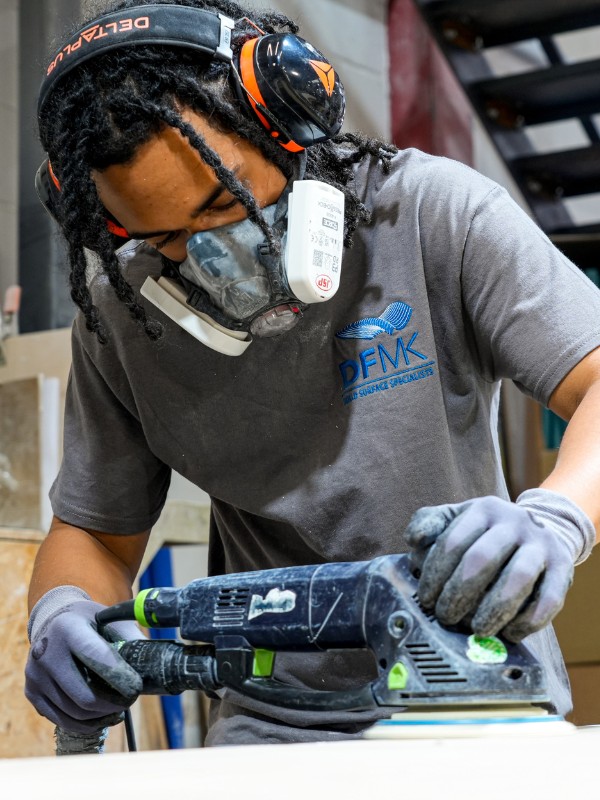 Premium worktop fabrication services At DFMK, we create solid surface worktops with precision, speed and a finish you can rely on. Whether you’re a trade customer looking for a dependable fabrication partner or a homeowner planning a one-off project, we deliver seamless results, on time and made to fit. With over 40 years of experience, we’re trusted by contractors, kitchen suppliers, interior designers and end users across the UK. We work with leading acrylic solid surface brands including Corian®, HIMACS, Hanex, Krion, Staron and more. Free quotes in 24 hours 10-day turnaround from templating to fitting Certified fabrication and installation Get in touch Why choose DFMK? We’re a family-run business with a solid reputation for speed and accuracy. From bespoke one-offs to repeat commercial orders, we treat every job with care, asking the right questions up front and seeing it through to a perfect fit. We’re approved by Corian® and HIMACS, which means you benefit from longer warranties, tighter quality control and proven technical skill. But more than that, you get a team that keeps things moving and gets the details right: Laser templating for a perfect fit Advice on brand and spec if needed Reliable turnaround Friendly team who knows the process inside out We understand what different clients need, whether that’s a retailer looking for fast lead times or a homeowner making a one-off decision for their space. With over 40 years of experience, we’ve refined our process to be clear, efficient and dependable, with the same level of care going into every job. Our worktop process Our process is designed to make life easier for homeowners, tradespeople and designers alike. Here’s how it works: Quote: Send us your specification and a dimensioned plan and we’ll send back a clear, no-obligation quote. Templating: Once approved, we’ll book in templating. We use laser equipment for precise measurements and an accurate fit. Fabrication: Worktops are fabricated in our UK workshop using CNC machinery and hand-finishing. Every detail is checked before delivery. 3D Visualisation (if needed): For more complex projects, we offer 3D visualisation – ideal for commercial briefs or unique shapes. Delivery or install: Choose supply-only or full installation. Either way, we’ll ensure your worktops arrive in perfect condition and go in with minimal fuss. Materials we work with We work with a wide selection of premium acrylic solid surface brands, so you can choose the colour, finish and spec that fits your project. We’ll help you choose the right material for your needs and talk you through the pros and cons if you’re unsure. Corian® Corian® is a well-established solid surface brand known for its seamless joins and design versatility. It’s a popular choice in both residential and commercial spaces, offering reliable performance and a clean, premium finish. All Corian® worktops come with a 10-year product warranty. HIMACS HIMACS offers exceptional durability, clean, seamless joins and a wide design range. It’s often chosen for its thermoforming capability, allowing for curved or more complex shapes without compromising strength. HIMACS surfaces are backed by a 15-year warranty. Hanex, Krion, Staron, Montelli and more We also fabricate using other trusted brands like Hanex, Krion, Staron and Montelli. These materials cover a wide range of looks and offer flexibility on colour, lead time and price without compromising quality. All our materials are selected to meet our standards for finish, durability and long-term reliability. Worktops we supply We fabricate and supply solid surface worktops for a range of settings, from domestic kitchens to commercial counters. Every project is made to measure, with the same care and consistency throughout. Kitchens Great kitchens start with great surfaces. We fabricate solid surface worktops that combine clean joins, sharp detailing and a flawless finish. Whether it’s a one-off feature or a full-scale development, we’ll shape something that works – practical, premium and built to last. Bathrooms Bathrooms work hard, and the surfaces in them need to keep up. We fabricate bathroom worktops, vanities and splashbacks using non-porous materials that are long-lasting and easy to clean, without the need for grout or sealing. Commercial Counters Reception desks, service counters and bar tops take a lot of wear, so they need more than good looks. Our solid surfaces are tailored to your space, easy to keep clean and strong enough to handle high footfall without losing their shine. Clinical & Specialist We fabricate seamless, non-porous surfaces that are easy to clean, resist bacteria and meet the demands of clinical, healthcare and specialist environments. Designed for hygiene and built to stand the test of time, they’re ideal for spaces where cleanliness can’t be compromised. Complete service from start to finish We support your project at every stage. From early design decisions to the final fit, our team brings practical experience and clear communication to every job. If you need help choosing the right brand, colour or specifications, we’ll talk you through the options and make sure you get what you need. For complex shapes or commercial spaces, we can provide 3D visualisation to help you plan ahead. Once your design is confirmed, we fabricate in our UK workshop using CNC machinery and hand-finishing. You can choose supply-only or let our specialist team handle the install. Either way, you’ll get clean results, reliable timelines and support when you need it. We’ll even guide you on aftercare to keep your surfaces looking good for years to come. Quality, certified From the materials we use to the finishes we apply, quality drives everything we do. Approved fabricator for Corian® and HIMACS, meeting strict quality standards Extended warranties available – up to 15 years, depending on brand Precision fabrication with thorough qualit