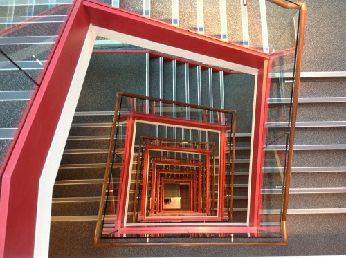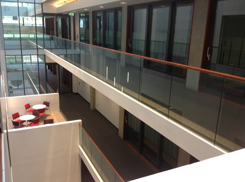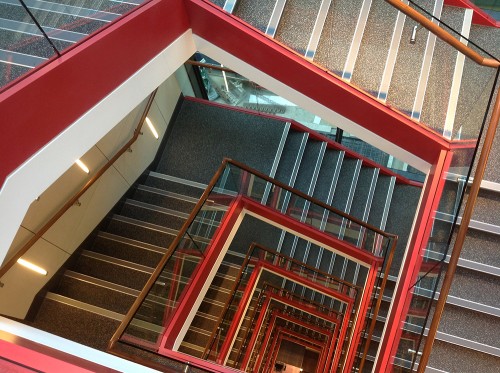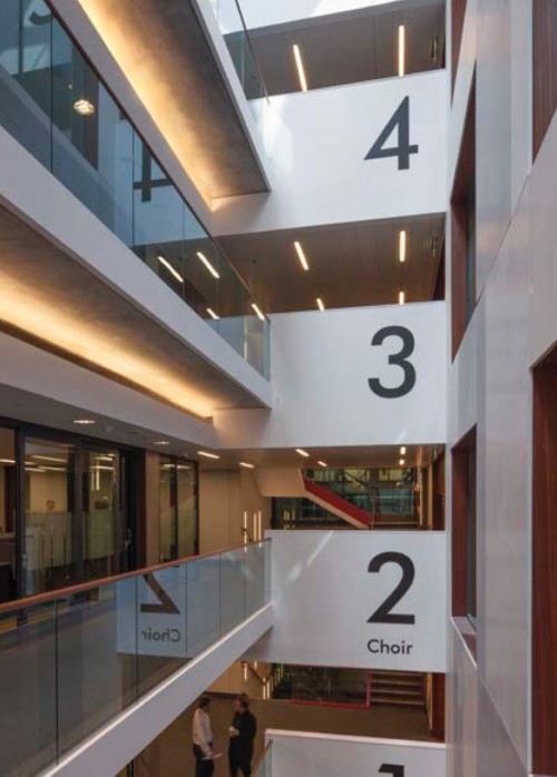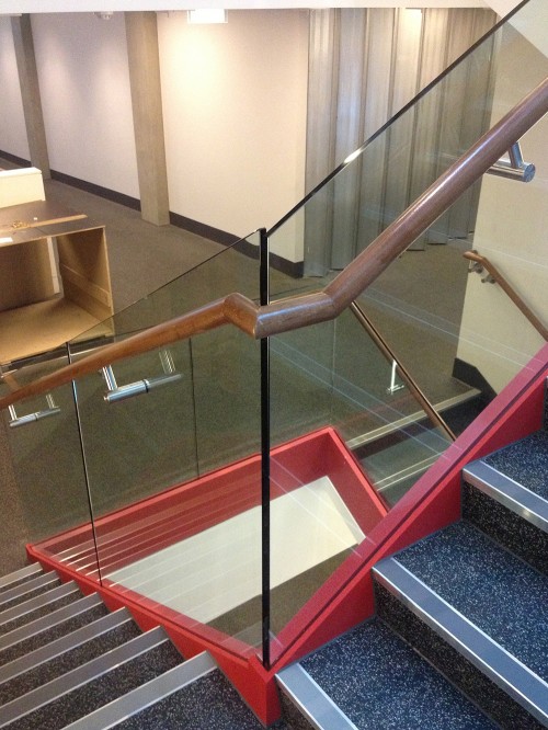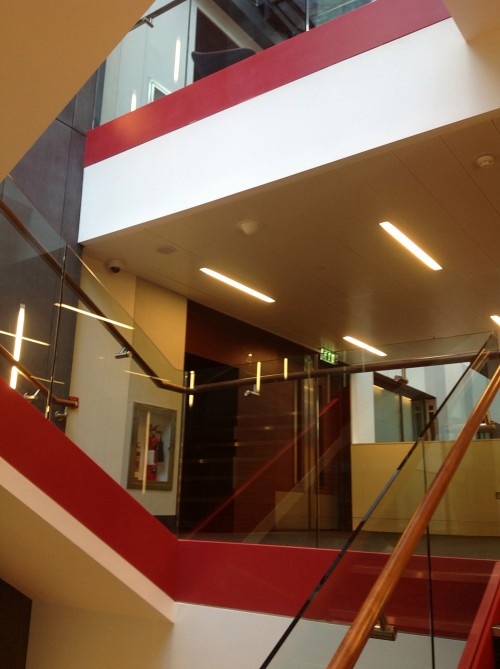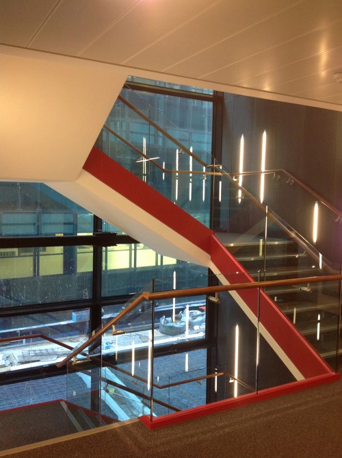 Guildhall School of Music & Drama Posted on July 28, 2014 by Katie Shaw Guildhall School of Music & Drama Working in conjunction with Sir Robert McAlpine, Lindner and RHWL Architects, this is one of the biggest projects that we have done. It involved cladding the inside and outside stair treads of four sets of stairwells in HIMACS Fiery Red and Alpine White, 7 stories high! But that wasn’t all….. we were also tasked with cladding all the balcony façades and numerous bulkheads. The idea was to create surfaces that would never require painting in order to reduce long term costs and increase the environmental credentials of the building. Furthermore, a lot of the areas that were cladded, wouldn’t be accessible once the building was completed. The end result has brought the architects vision to life with a striking and practical solution.